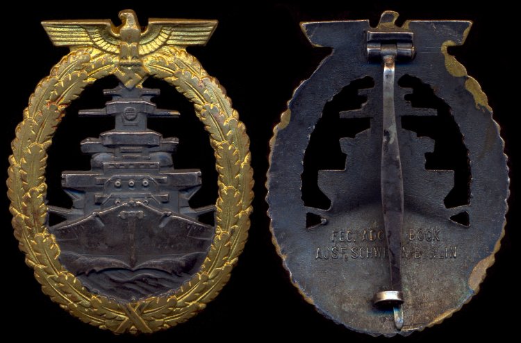 Established on April 30, 1941, by order of the Supreme Commander of the Navy for the crews of battleships and cruisers that were engaged in the war. The establishment was justified as follows: “In the battle against England, battleships and cruisers, with their long-range and bold operations, inflicted significant losses of ship tonnage on the enemy and thus further constricted the blockade of England.” The new decoration could be awarded for merit and effective leadership in one or more naval campaigns, totaling at least 12 weeks, participation in particularly successful actions, loss of one’s own ship due to enemy action, and injuries. The awarding of this probably unique sign of the high seas fleet with diamonds was shrouded in secrecy for a long time. Like in other cases, it was supposed to be awarded after receiving the Knight’s Cross with Oak Leaves. Only one admiral came into consideration for this, but he never received the decoration. On the other hand, an unequivocal original is found in a certain British post-war collection. It wasn’t until 1992 that a specimen of this decoration appeared at an auction of the estate of Admiral Otto Schniewind (1887-1964) in Hamburg, who had “only” the Knight’s Cross, and it was last sold for over 40,000 German Marks.
