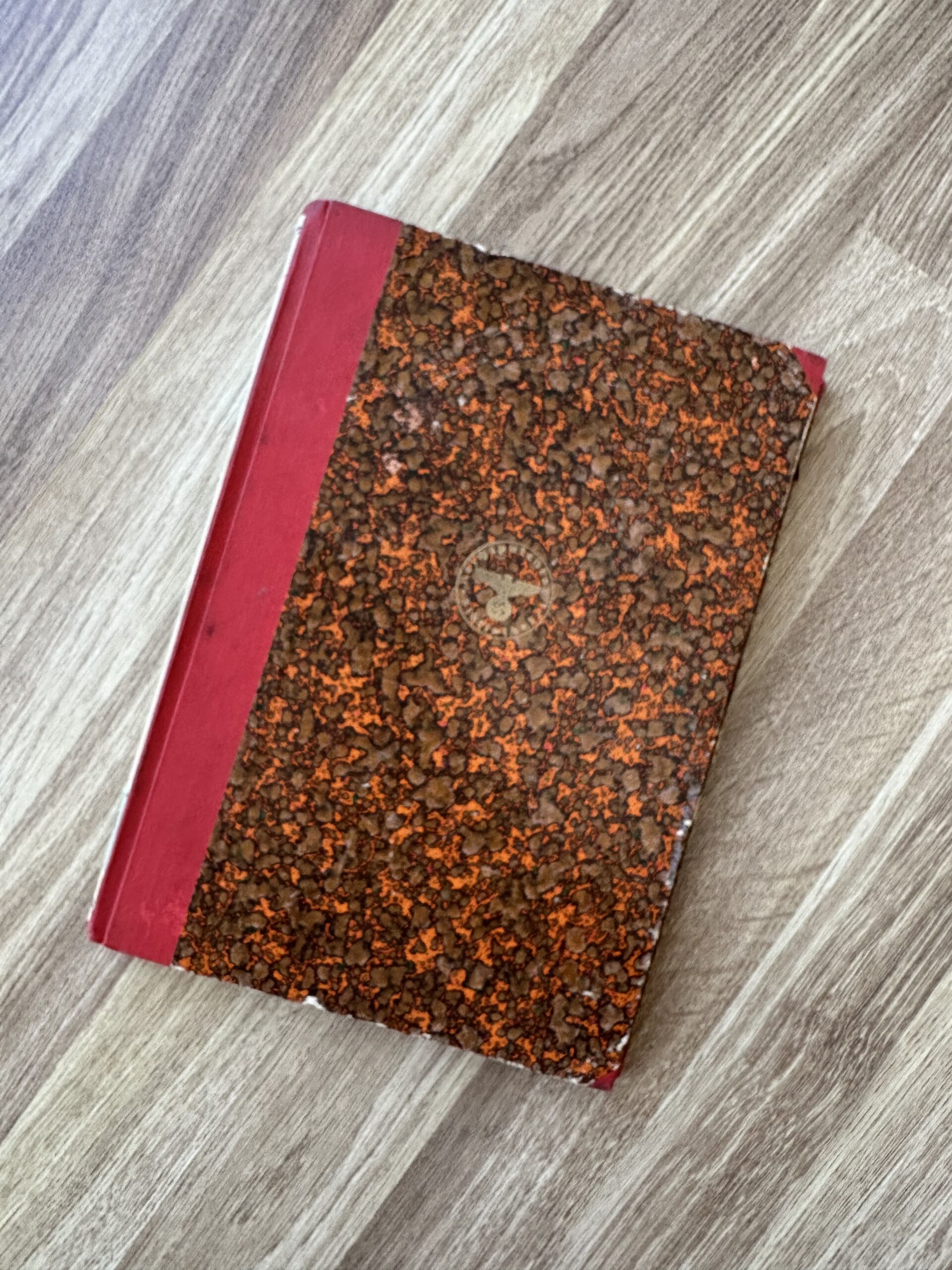 This is a unique piece of history: an original World War II-era German patent document, preserved in what appears to be a patent book. The cover features a classic marbled design with a red spine, showcasing an emblem suggestive of official Third Reich documentation. The book’s historical value is further accentuated by the presence of an eagle, a symbol widely used during the period, stamped on the front.