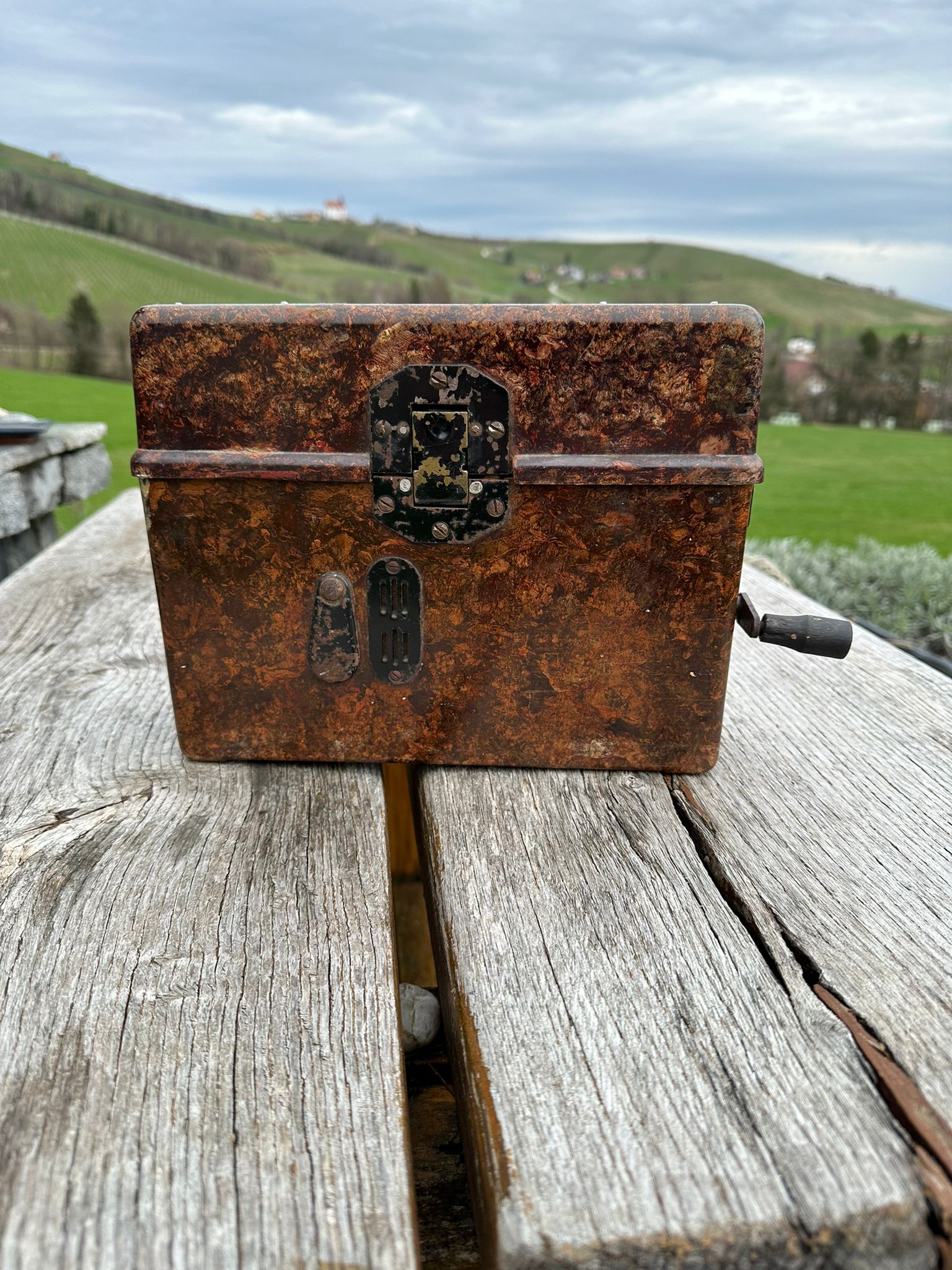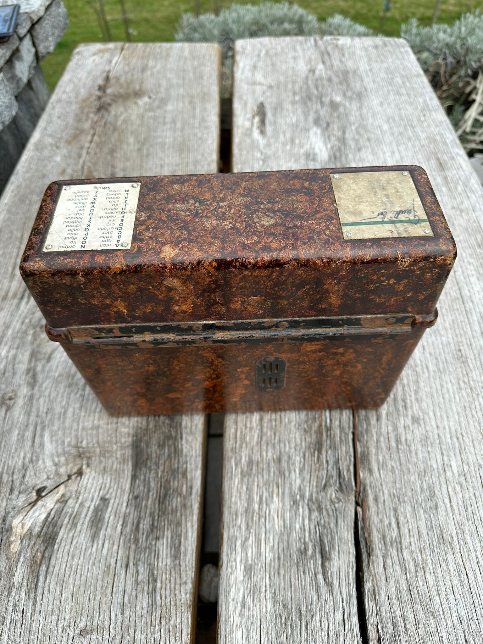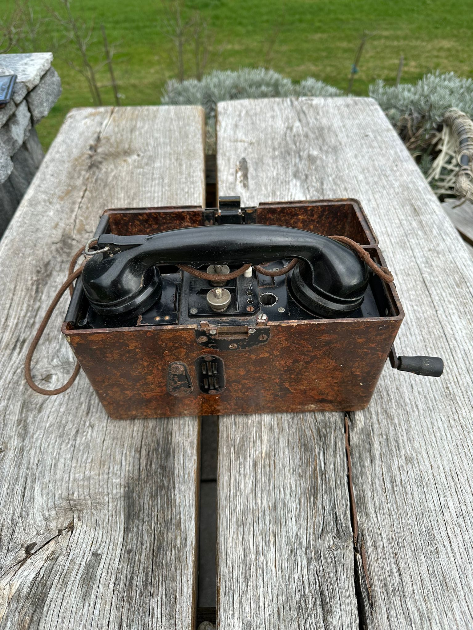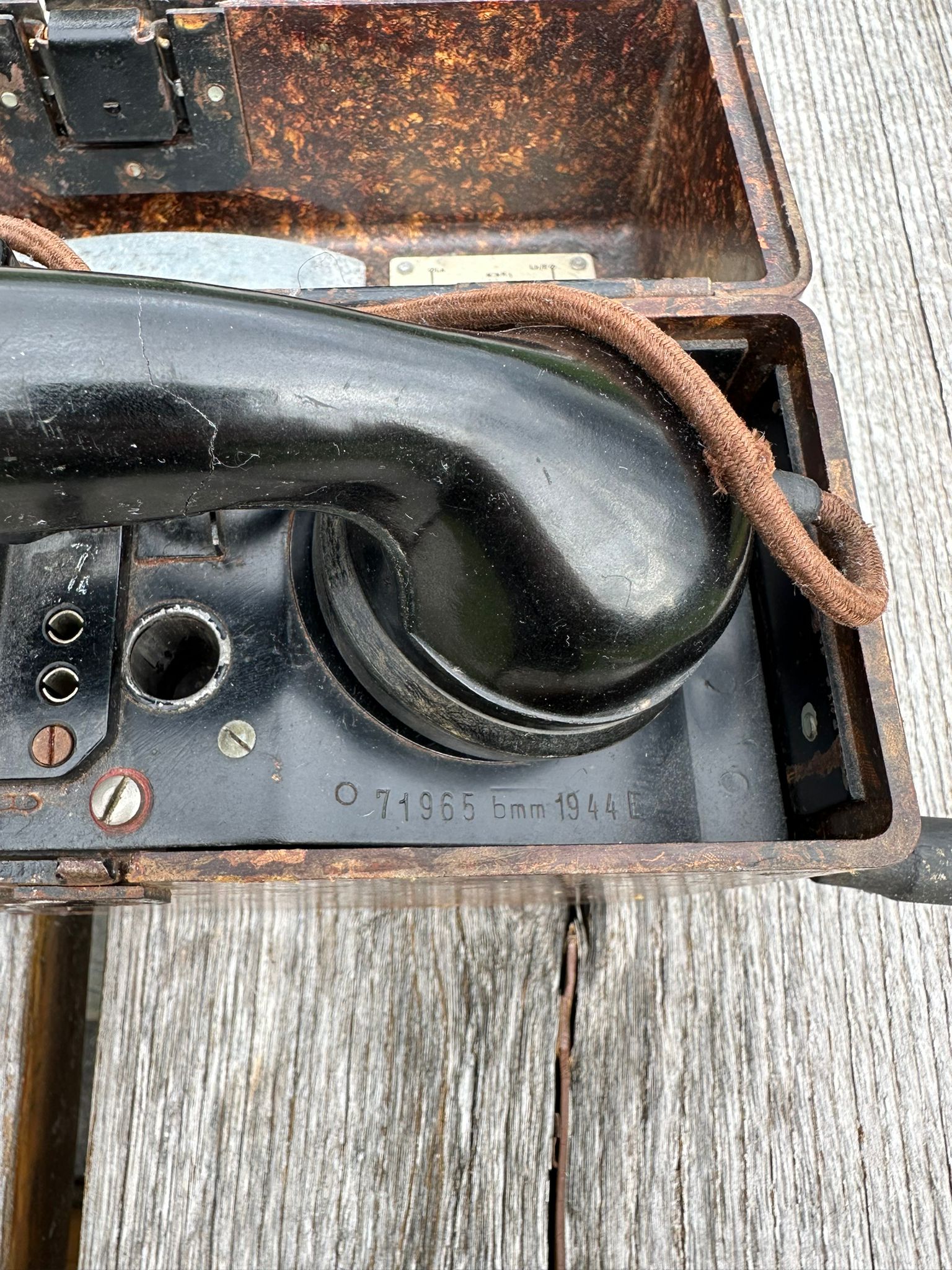 Offered is an original 1944 dated Model 1933 field telephone. Very good bakelite outer casing, with no cracks or damage, with phonetic code to top and all the correct loop holes and jack plug inserts. Working locking latch, which opens to show the telephone, cable (showing use and fraying – but serviceable).
